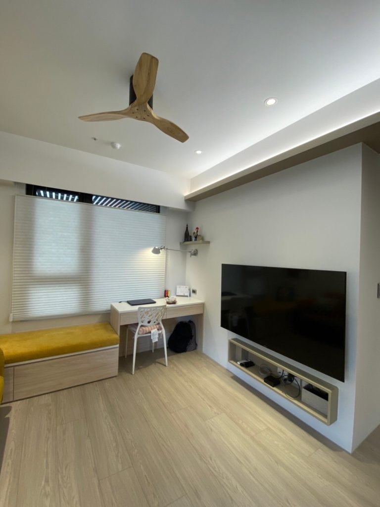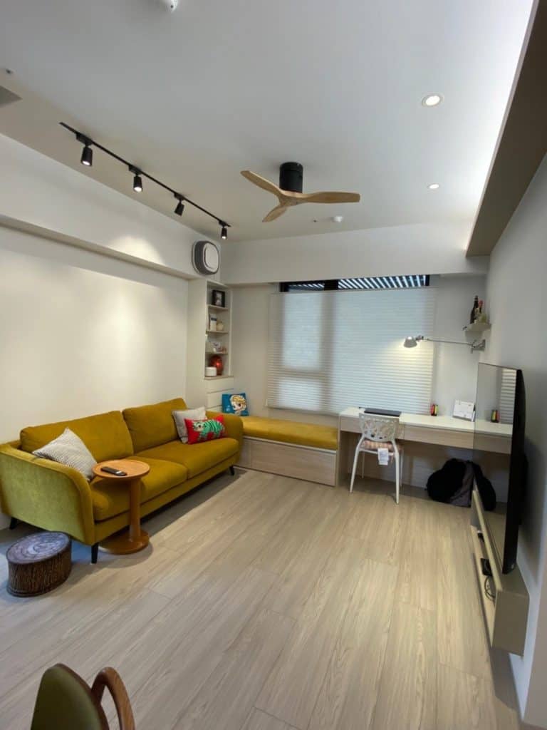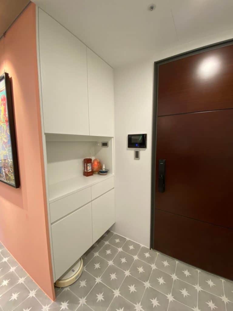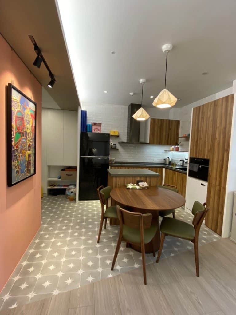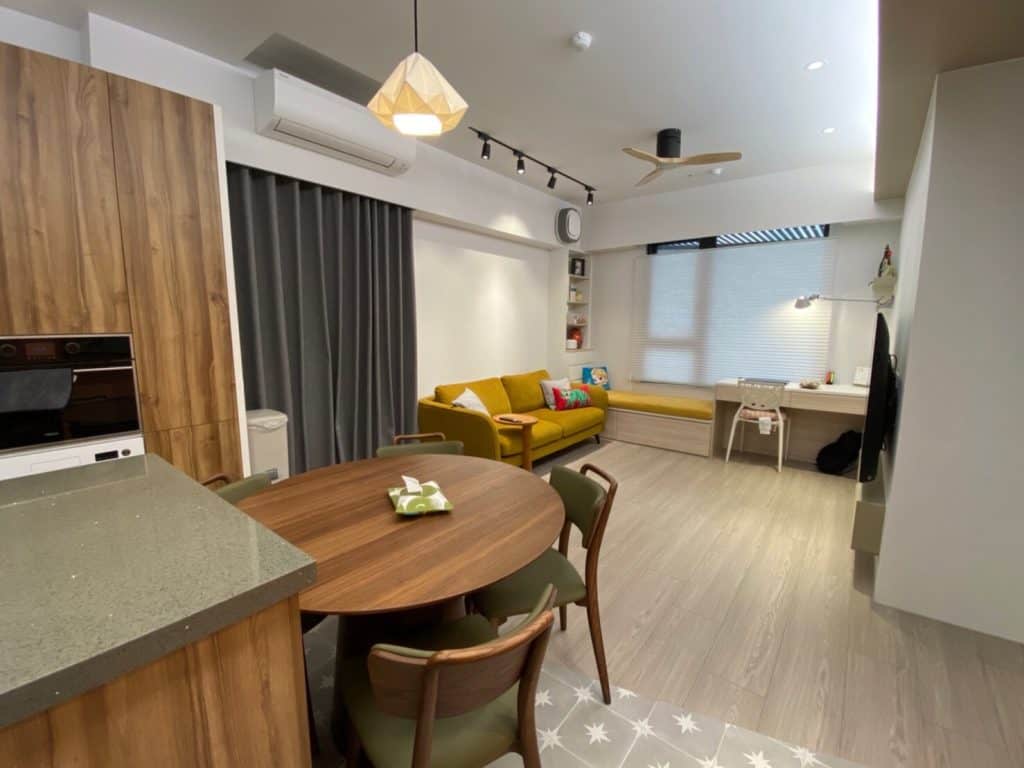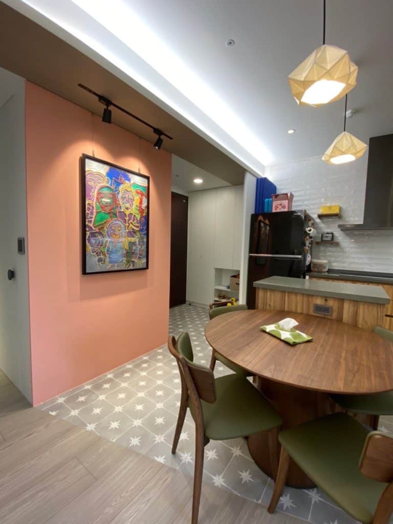 在關渡的這個案子中,我們在簡約的基調中加入了不少個性化元素。最吸睛的莫過於走道旁的大地色系方塊拼貼磁磚牆,復古又帶點俏皮的質感,成為空間中獨一無二的端景。