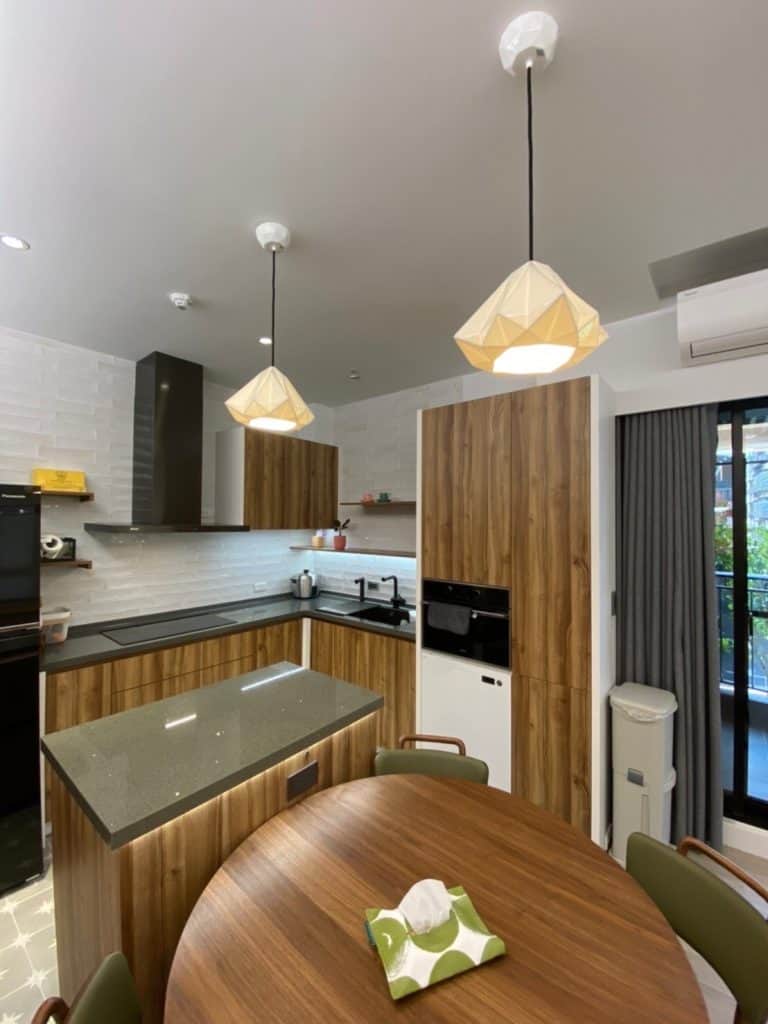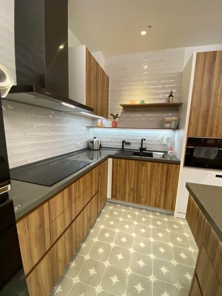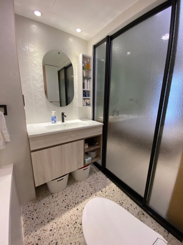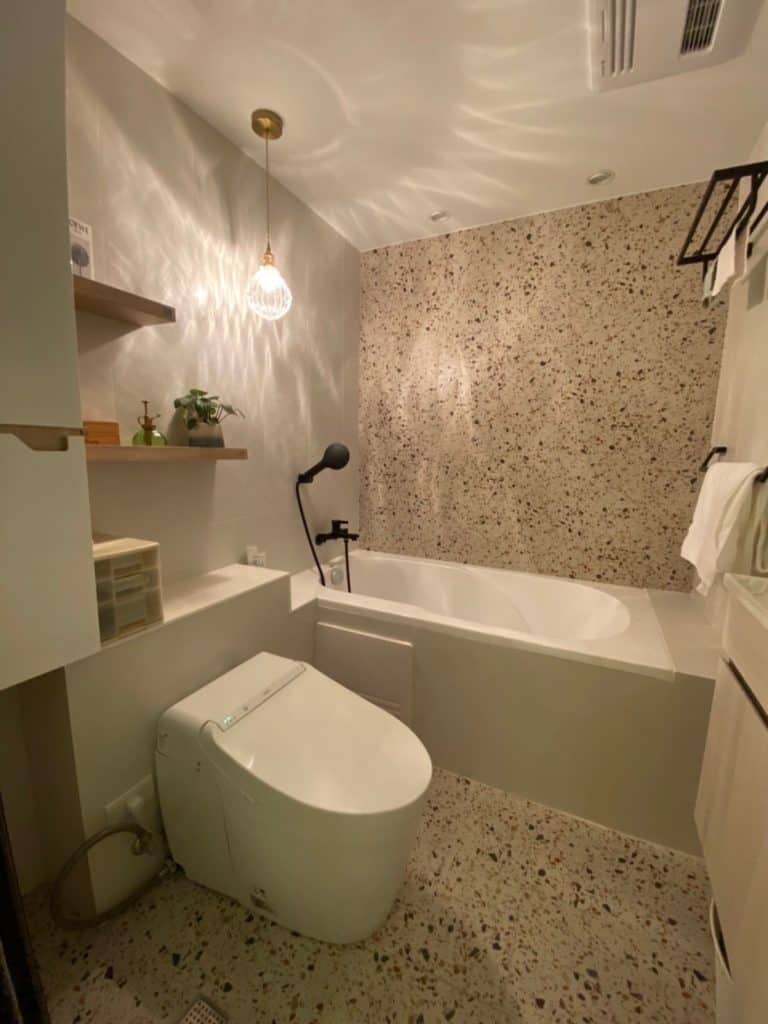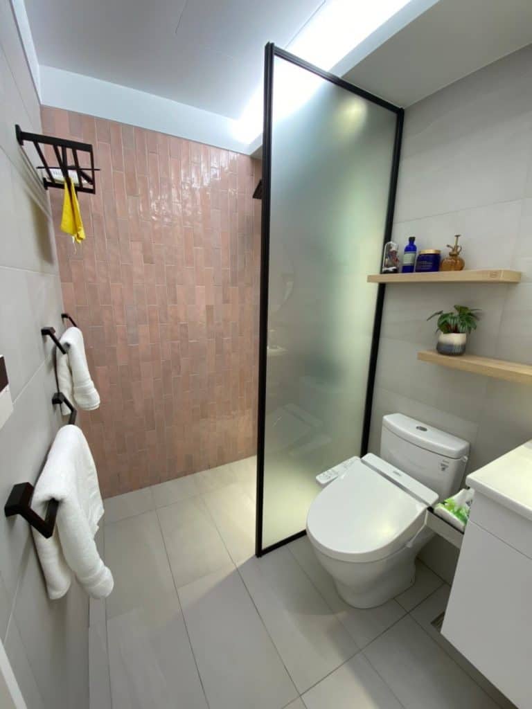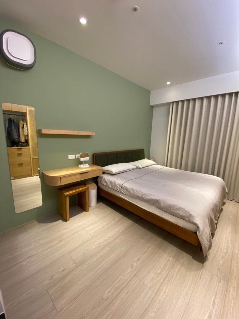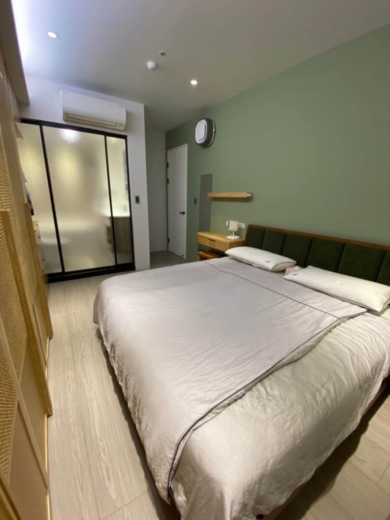 在關渡的這個案子中,我們在簡約的基調中加入了不少個性化元素。最吸睛的莫過於走道旁的大地色系方塊拼貼磁磚牆,復古又帶點俏皮的質感,成為空間中獨一無二的端景。