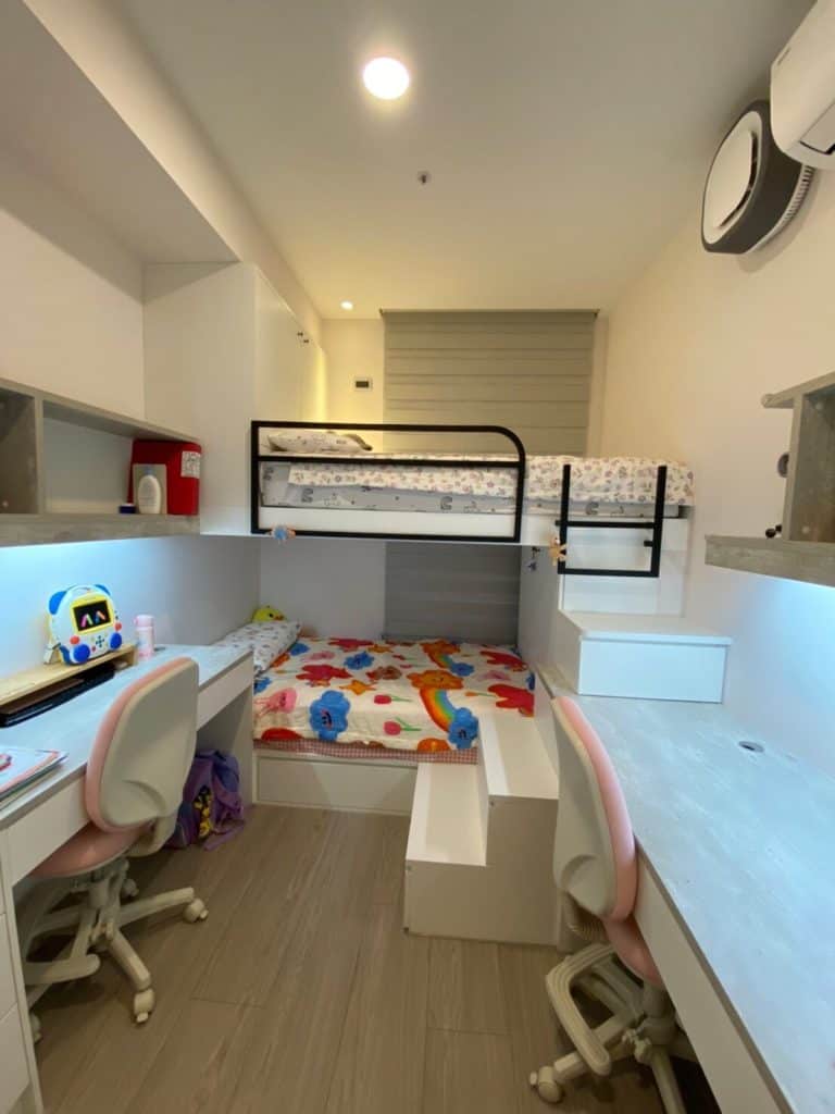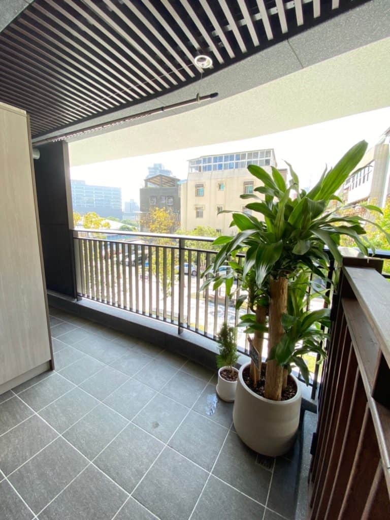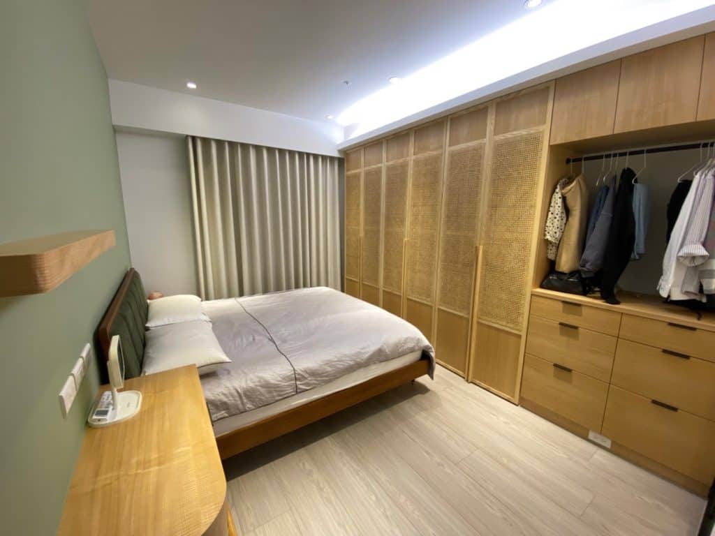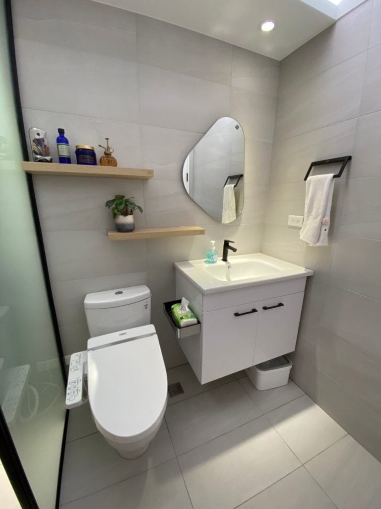 空間中運用了俐落的黑色鐵件來勾勒線條,例如開放式掛衣架、櫃體框架以及與木作結合的展示架,為溫馨的木質空間注入了一股現代工業風的個性。多功能室採用了木框玻璃拉門設計,地板架高增加收納,既通透又實用。衛浴空間則選用灰色石紋磚搭配黑框淋浴門,展現飯店級的現代質感。
