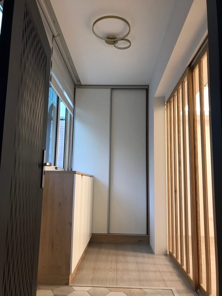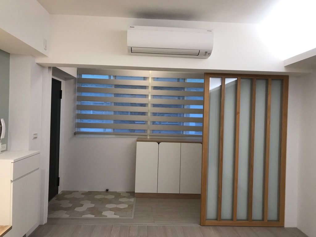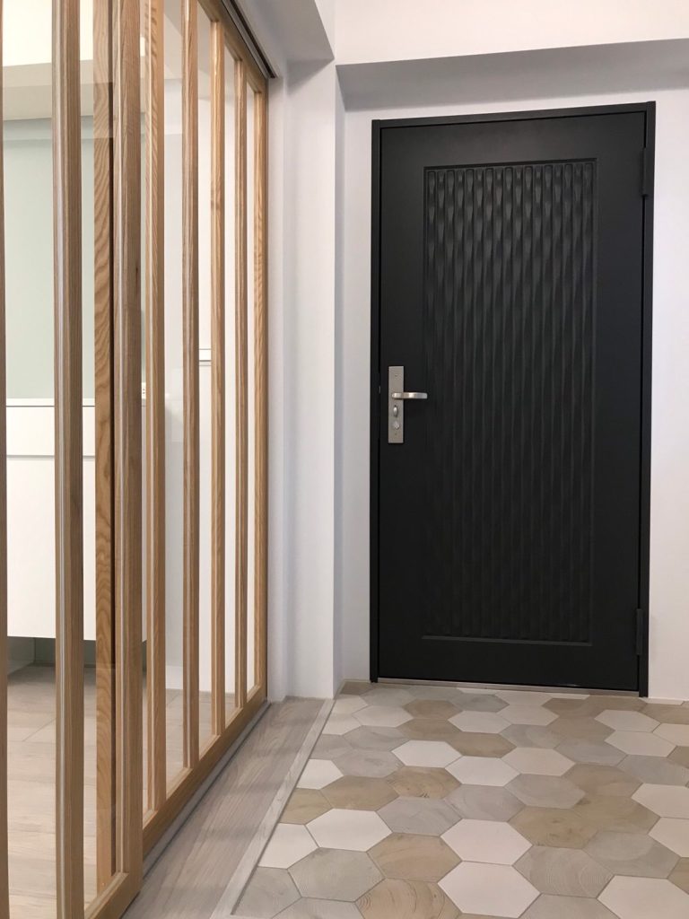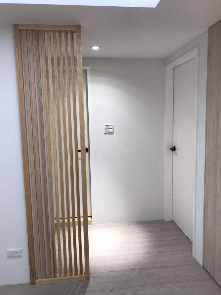 玄關區域地坪鋪設了幾何造型的六角花磚(蜂巢磚),明確界定出落塵區;進入室內的過渡空間,則設計了溫潤的木質格柵(柵欄)屏風,既化解了風水疑慮,也保留了光線與視線的穿透感,帶出濃厚的日式無印風情。