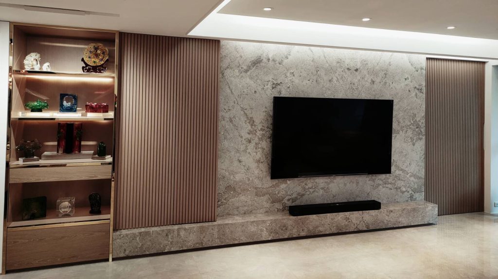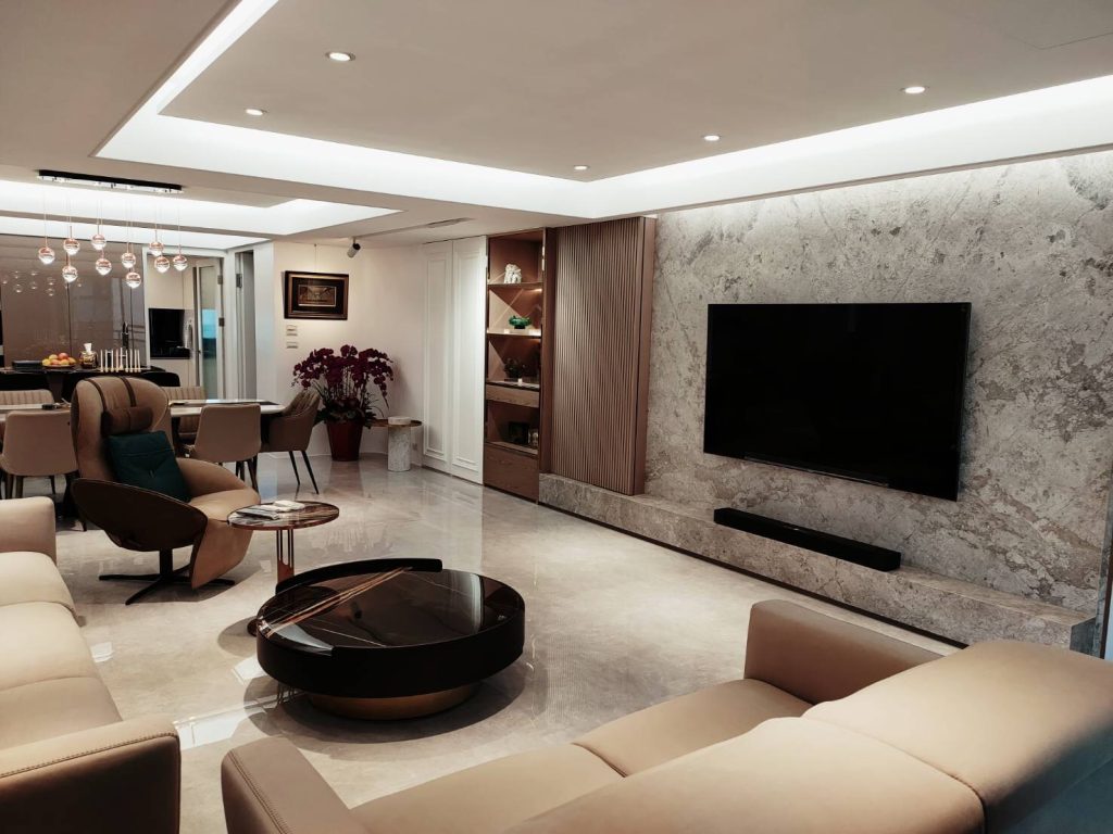 本案位於民生東路,展現了豪宅尺度的寬闊與大器。設計師運用大量的天然大理石作為電視主牆,其奔放的紋理奠定了空間的氣勢;兩側對稱的展示櫃結合了鍍鈦金屬與燈光設計,在細節中流露奢華質感。