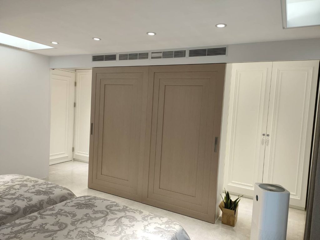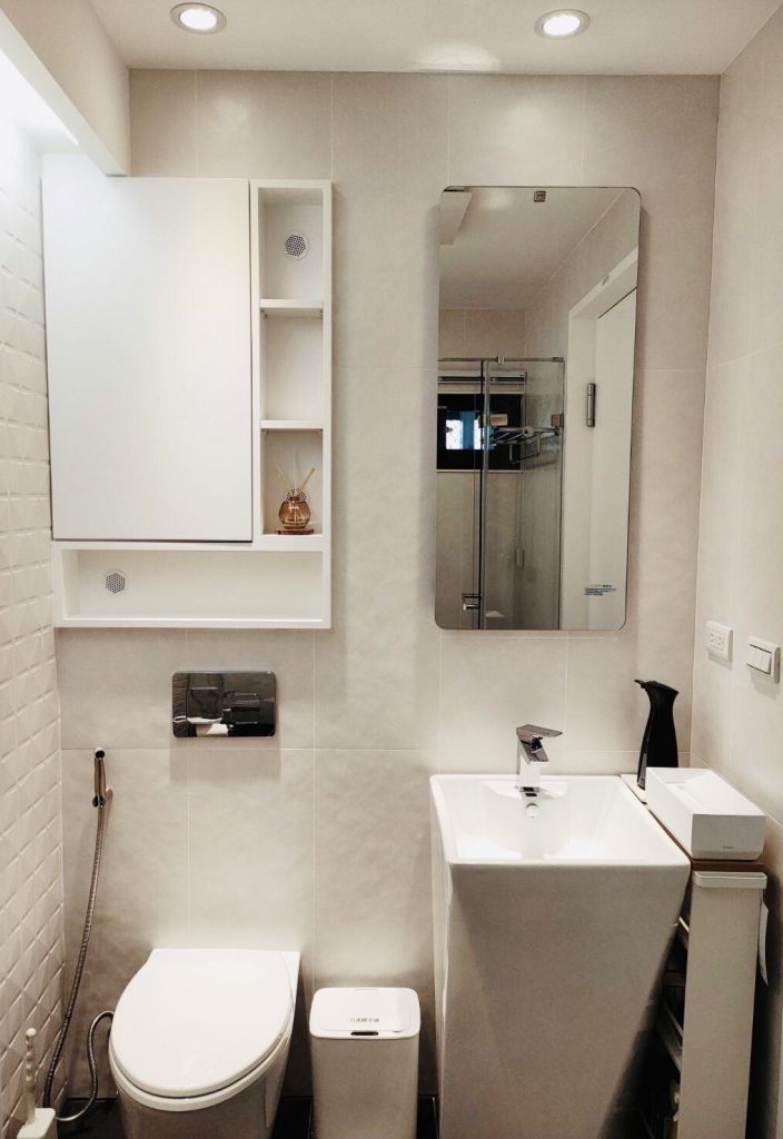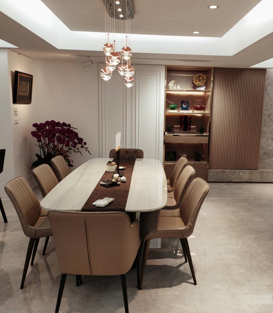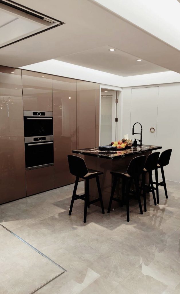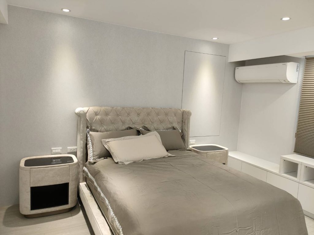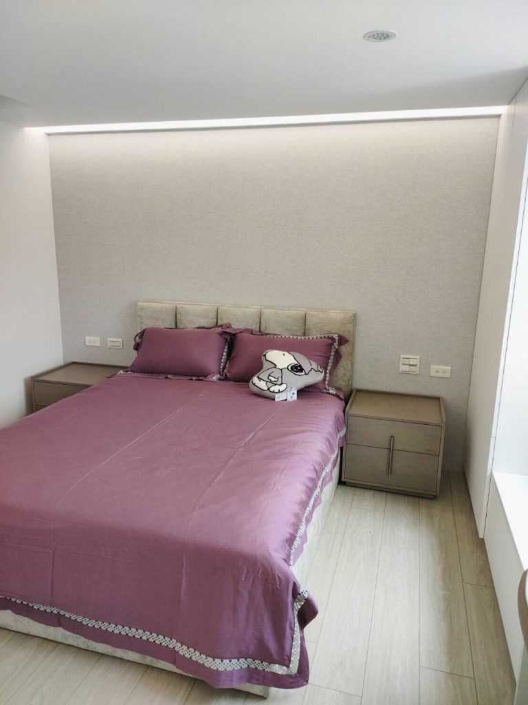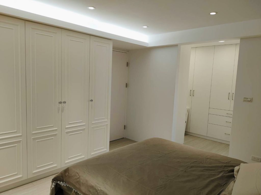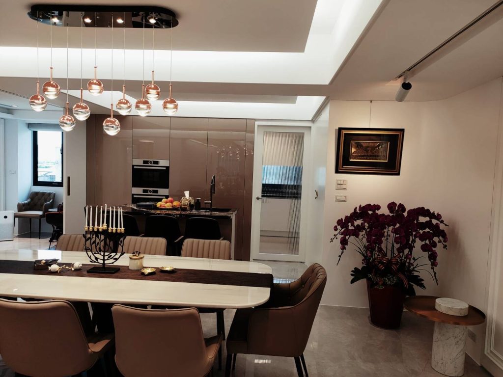 開放式的餐廚區是凝聚情感的核心,中島吧台上方懸掛著極具標誌性的玫瑰金泡泡吊燈,搭配大理石餐桌,營造出如頂級餐廳般的用餐氛圍。臥室區域則延續了飯店式設計,床頭使用精緻的繃布與線板造型,搭配隱藏式的大面推拉門衣櫃,將收納機能完美隱藏於無形,還給睡眠空間最純粹的寧靜。