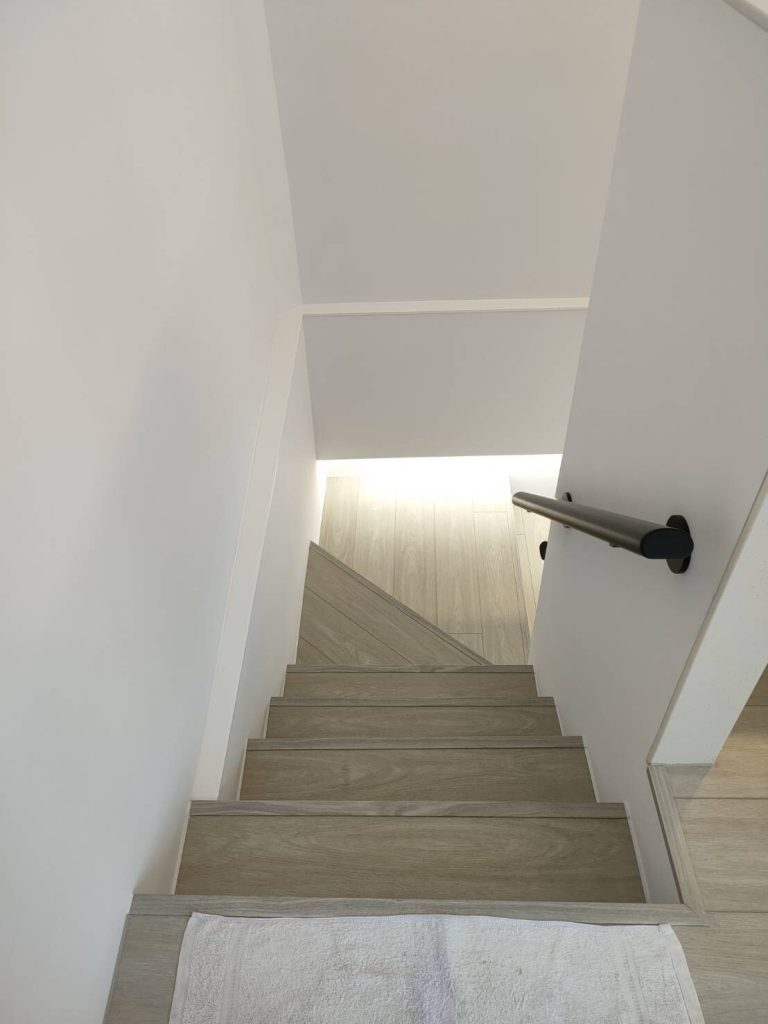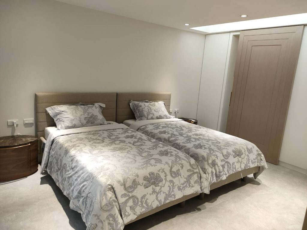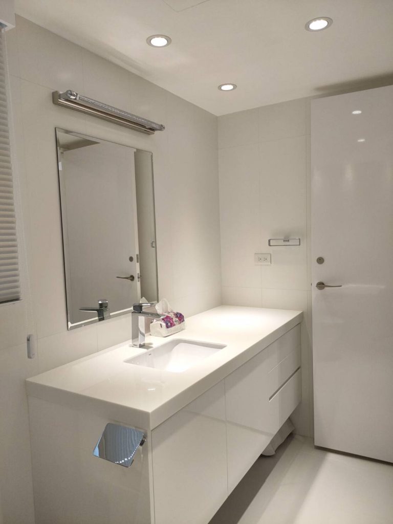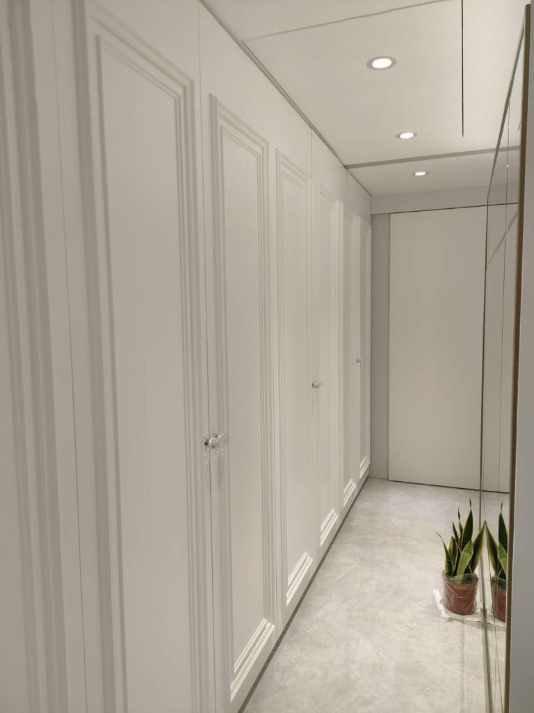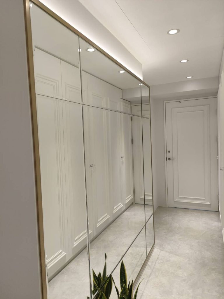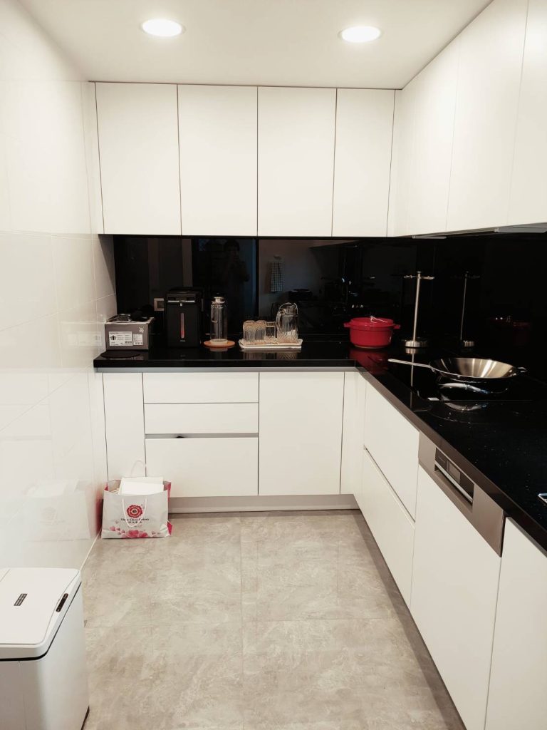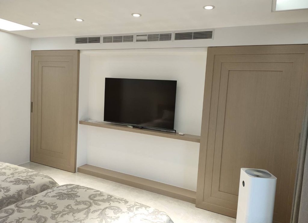 開放式的餐廚區是凝聚情感的核心,中島吧台上方懸掛著極具標誌性的玫瑰金泡泡吊燈,搭配大理石餐桌,營造出如頂級餐廳般的用餐氛圍。臥室區域則延續了飯店式設計,床頭使用精緻的繃布與線板造型,搭配隱藏式的大面推拉門衣櫃,將收納機能完美隱藏於無形,還給睡眠空間最純粹的寧靜。