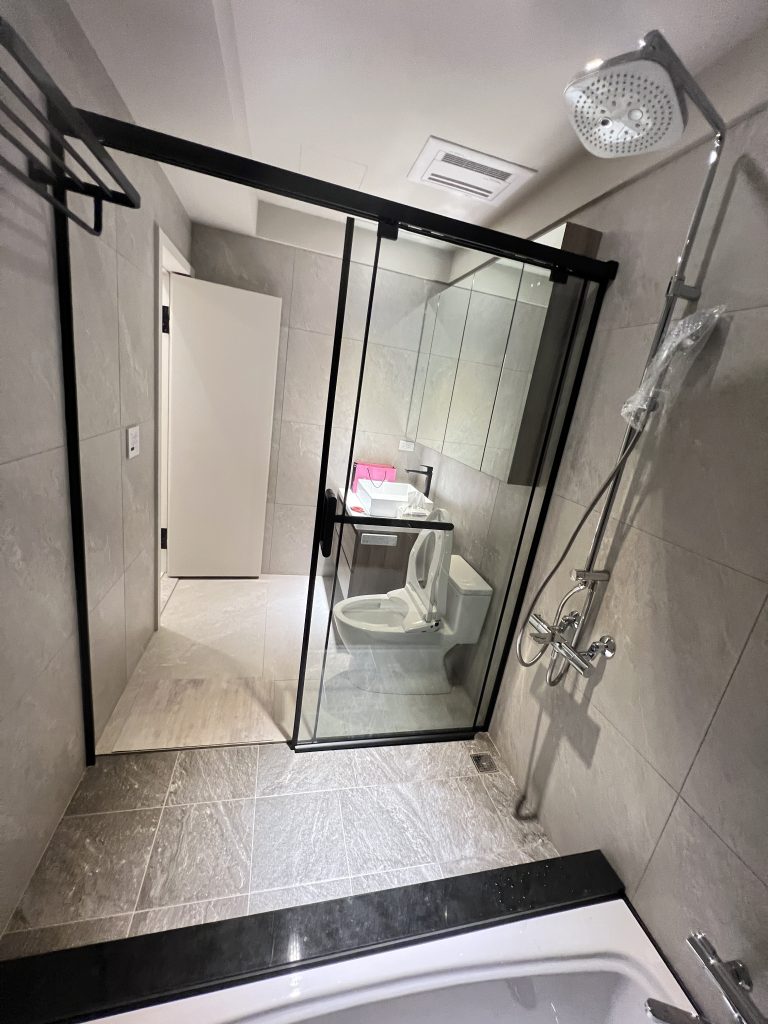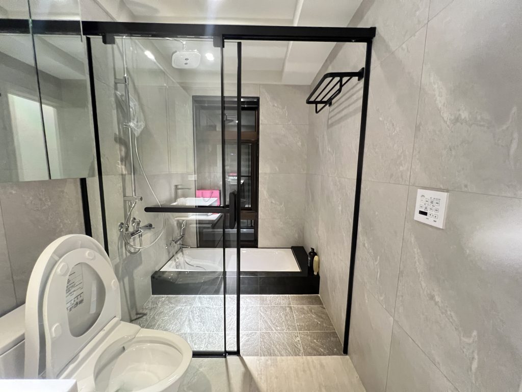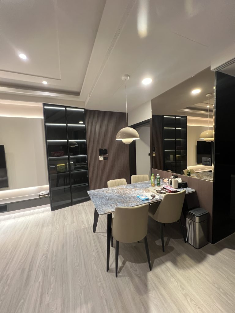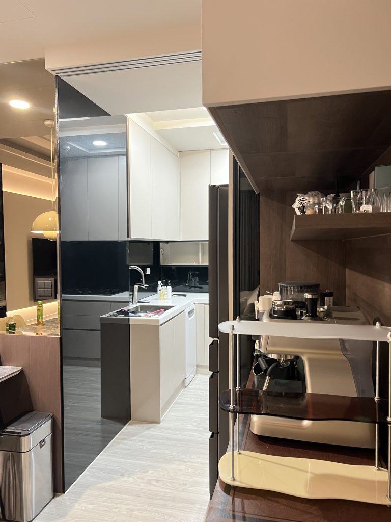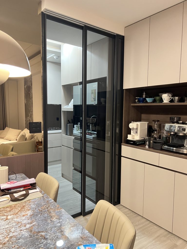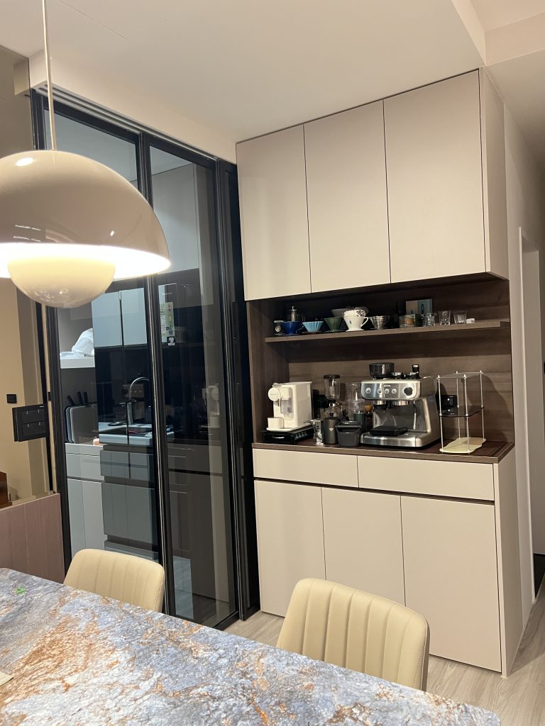 空間中運用了大量的黑框玻璃展示櫃,內嵌柔和的燈條,不僅展示了屋主的收藏,更讓收納櫃體變得輕盈通透。餐廳區規劃了專屬的咖啡吧台與電器櫃,深色木紋與黑玻的結合,更增添了一份成熟的品味。