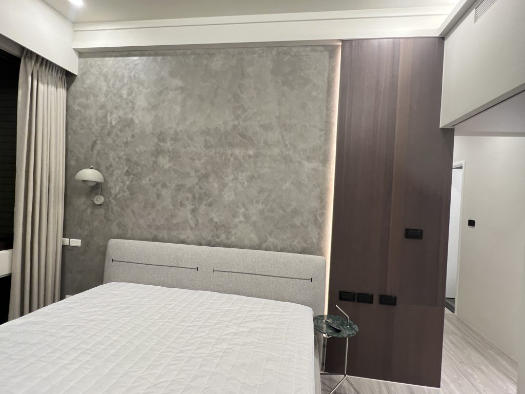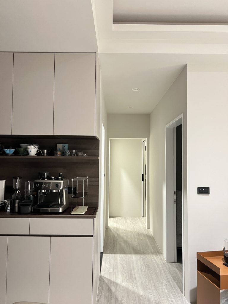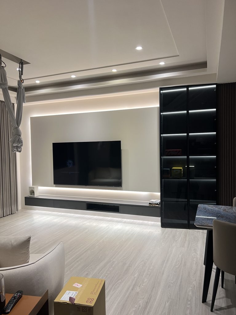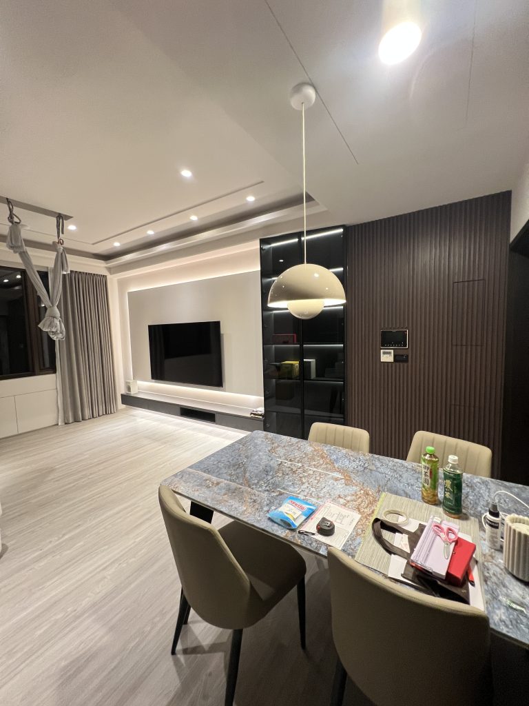 這是一個位於內湖,充滿現代輕奢質感的居住空間。設計團隊以低飽和度的灰階特殊塗料為牆面基底,搭配弧形沙發的柔和線條,營造出沈穩卻不冰冷的現代美學。