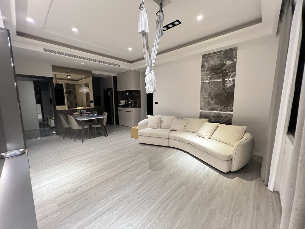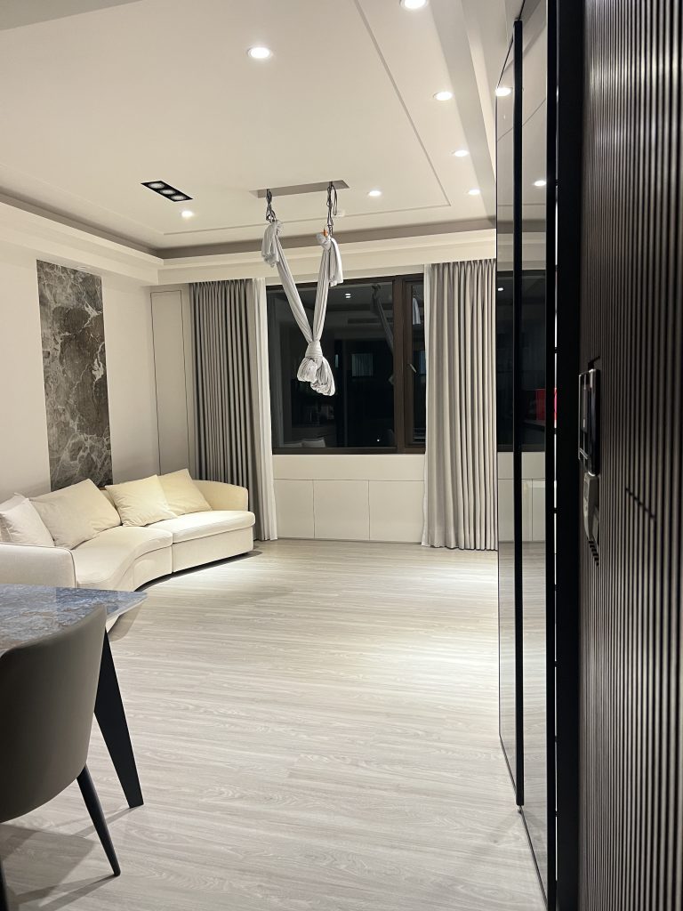 客廳天花板特別強化結構,安裝了專業的空中瑜伽吊床,將運動休閒完美融入居家生活。大面積的落地窗引入自然光,讓屋主在伸展時能享受絕佳的視野。